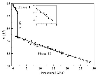 PbCrO3立方钙钛矿高、低压相的压力-体积关系,显示相变导致9.8%的体积变化