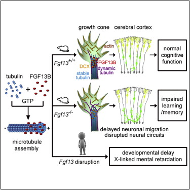 通过敲除小鼠的FGF13基因实验发现,在大脑发育过程中如果降低FGF13B的表达水平,可以导致大脑皮层和海马中神经元迁移发生迟滞,被敲除基因的小鼠无法正常进行学习与记忆,与X-连锁智力障碍病人相似。