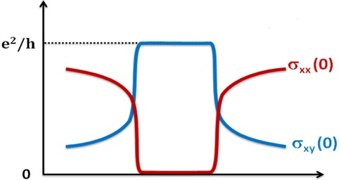 量子反常霍尔效应的原理示意图:当化学势(chemical potential)位于铁磁拓扑绝缘体的狄拉克点处打开的能隙内时,其零磁场的反常霍尔电导sxy(0) 达到量子电导e2/h的数值并形成平台,而其纵向电导sxx(0)变为0。