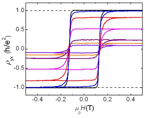 量子反常霍尔效应的实验数据图:不同的曲线显示在不同栅极电压下材料霍尔电阻ryx 随磁场的变化。在一定的栅极电压范围内,零磁场的反常霍尔电阻数值达到量子电阻的数值h/e2。