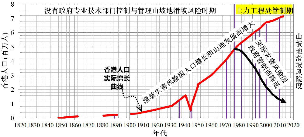 图4. 香港人口增长和土地发展与山坡地滑坡风险度的变化对应关系