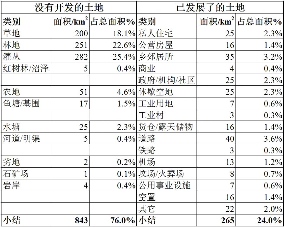 表1. 土地用途的分布情況(截至2012年年底,香港2013年鉴)