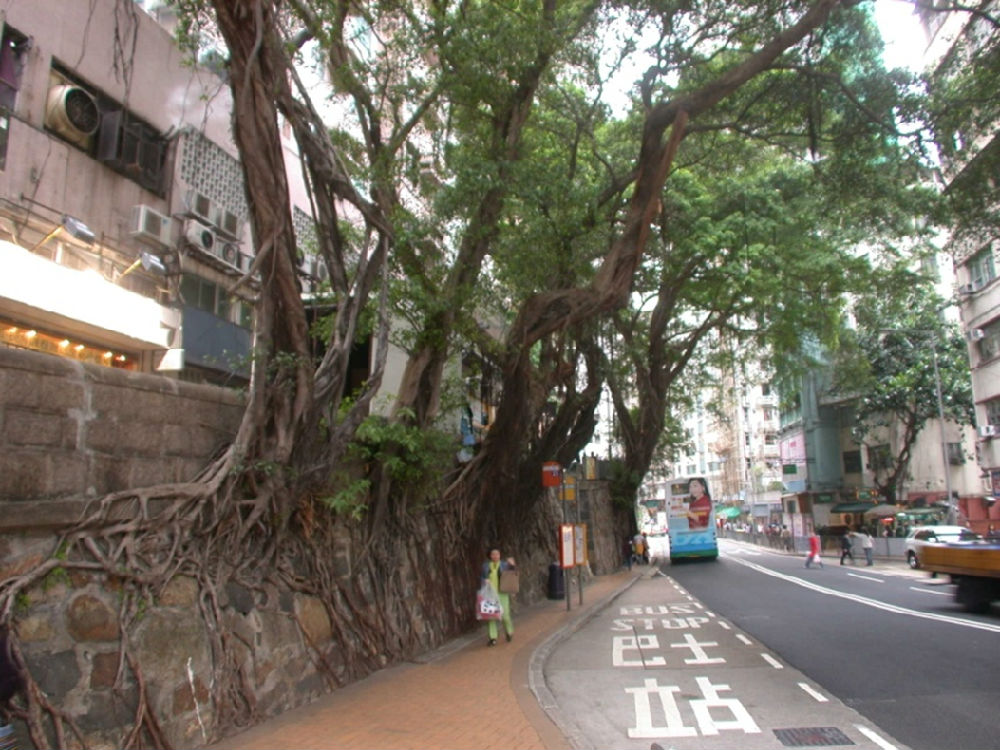 图8. 香港岛西半山般咸道边旧石砌挡土墙上生长出的大树成为大厦和街道间的盆景