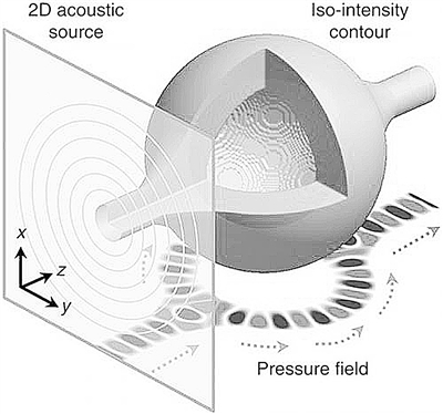 声波跟光波类似,都是沿一条直线传播,但其路径会由于反射、衍射或折射而弯曲。超声医学成像、材料检测就是利用了这一原理。比如超材料就是一种能让声波、光波弯曲的人造纳米结构,但这些材料本身的性质限制了它们的应用,尤其在生物学方面。“我们想不靠人工介质也能弯曲声波场。”劳伦斯·伯克利实验室材料科学分部主管张祥(音译)说,“我们的瓶子束技术能设计并合成‘声波瓶’,引导声波按设计的曲线通过齐性空间,而无需介质材料或其他任何人工设计材料。”